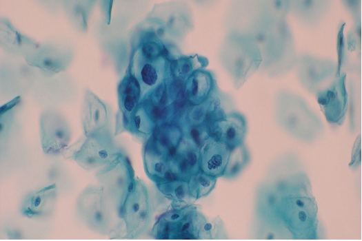 Vaginal smear in a 54 year old lady. Identify the cluster of cells in the centre of the field. Are they normal or abnormal?
