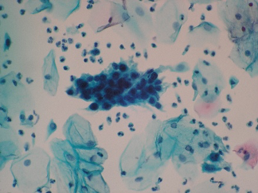 The cluster of cells in the centre of the field appear to be endocervical in origin. (Note the cytoplasmic tails on the right margin of the cluster).
