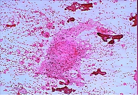 Aspirate from a mass in the right breast of a 30 year old female, slips on palpation. Make you diagnosis. Give 2 points in favour of it. What unusual findings do you see in the lesion?