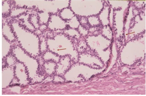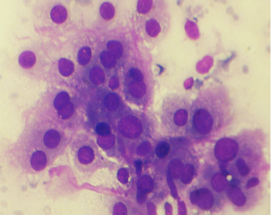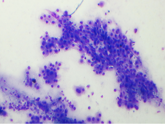 Ultrasonically guided fine needle aspiration cytology of a mass in front of the neck of a 40 year old female. Patient complained of severe back ache and had osteoporosis. Fig 1 and Fig 2 : are shown. Make your diagnosis.