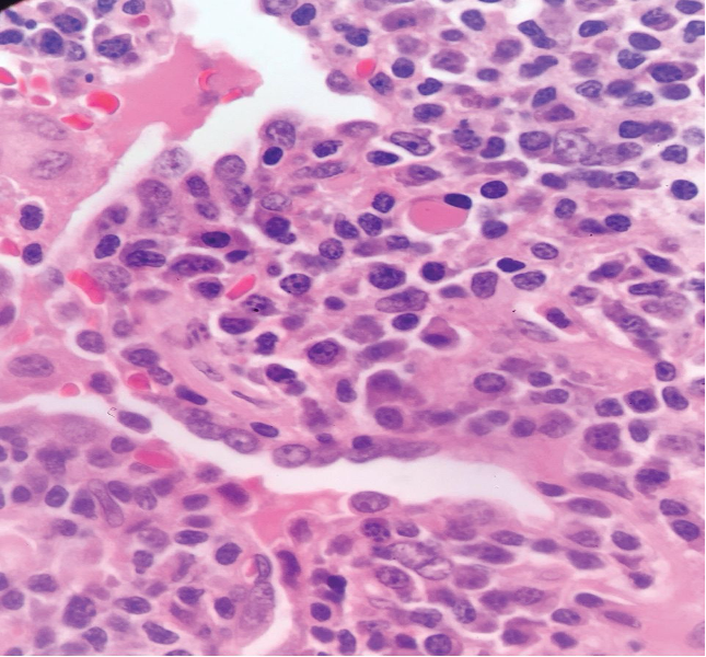Highly suggestive of papillary adeno-carcinoma Endometrium - Shows adequate cellularity with papillae of carcinoma cells showing hyperchromatic and pleomorphic nuclei, highly suggestive of papillary adenocarcinoma of the endometrium.