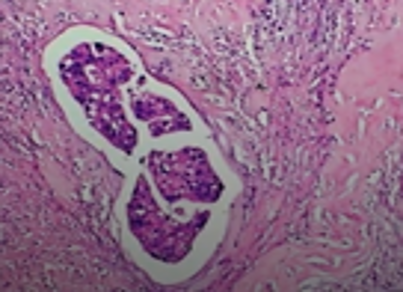 Section from a well circumscribed swelling in the breast of a pregnant lady. What change are the acini showing? What do you think is the lesion?