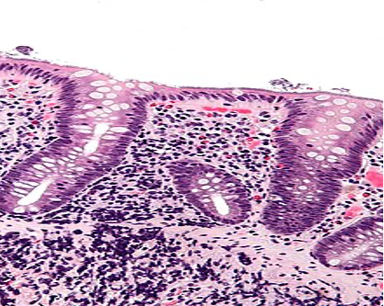 Fig shows an endoscopic biopsy from a 54 year old individual. Identify the anatomical part of the intestine. What is the pathology. With what clinical symptoms do these patients present? (see surface epithelium)